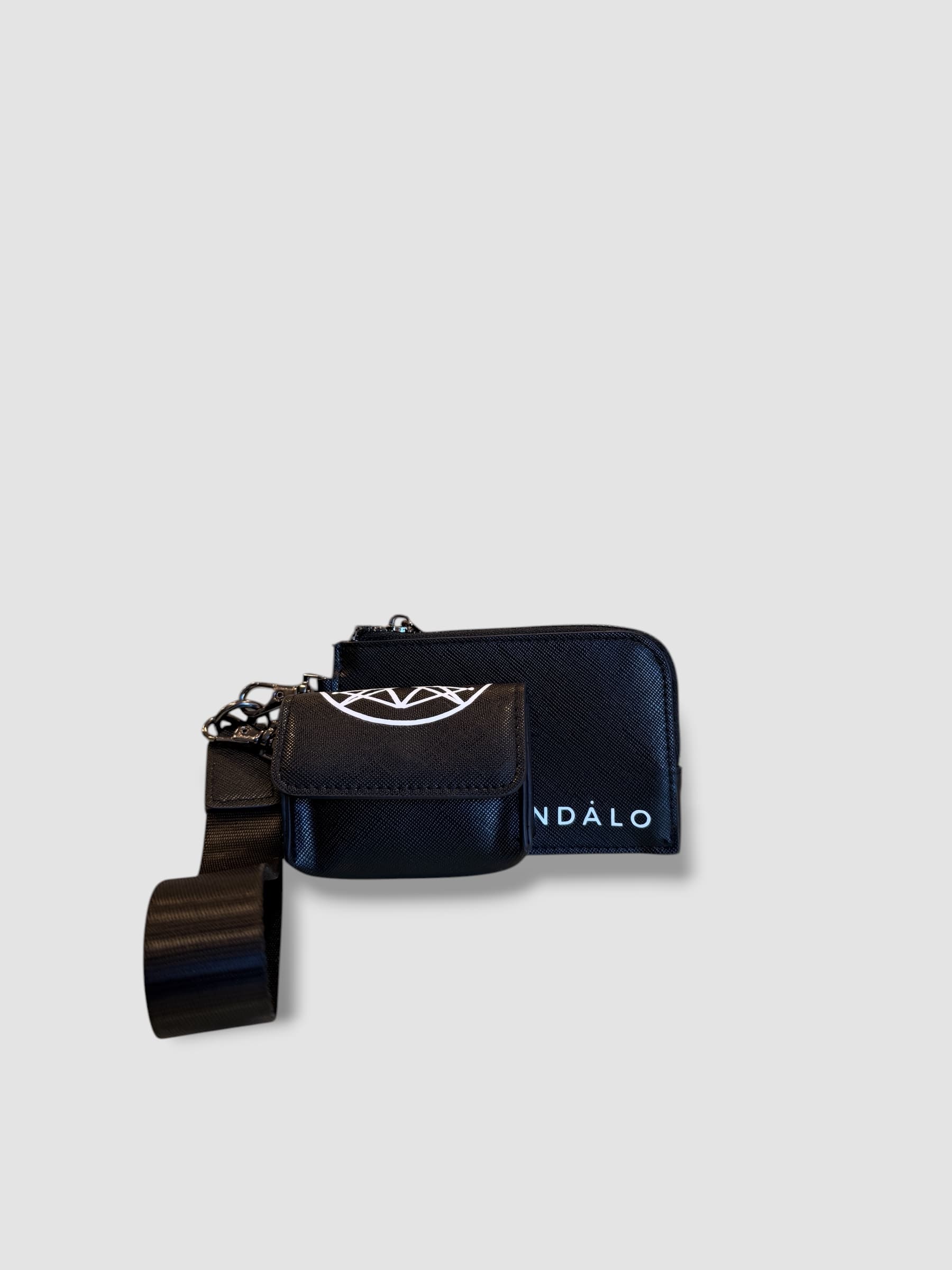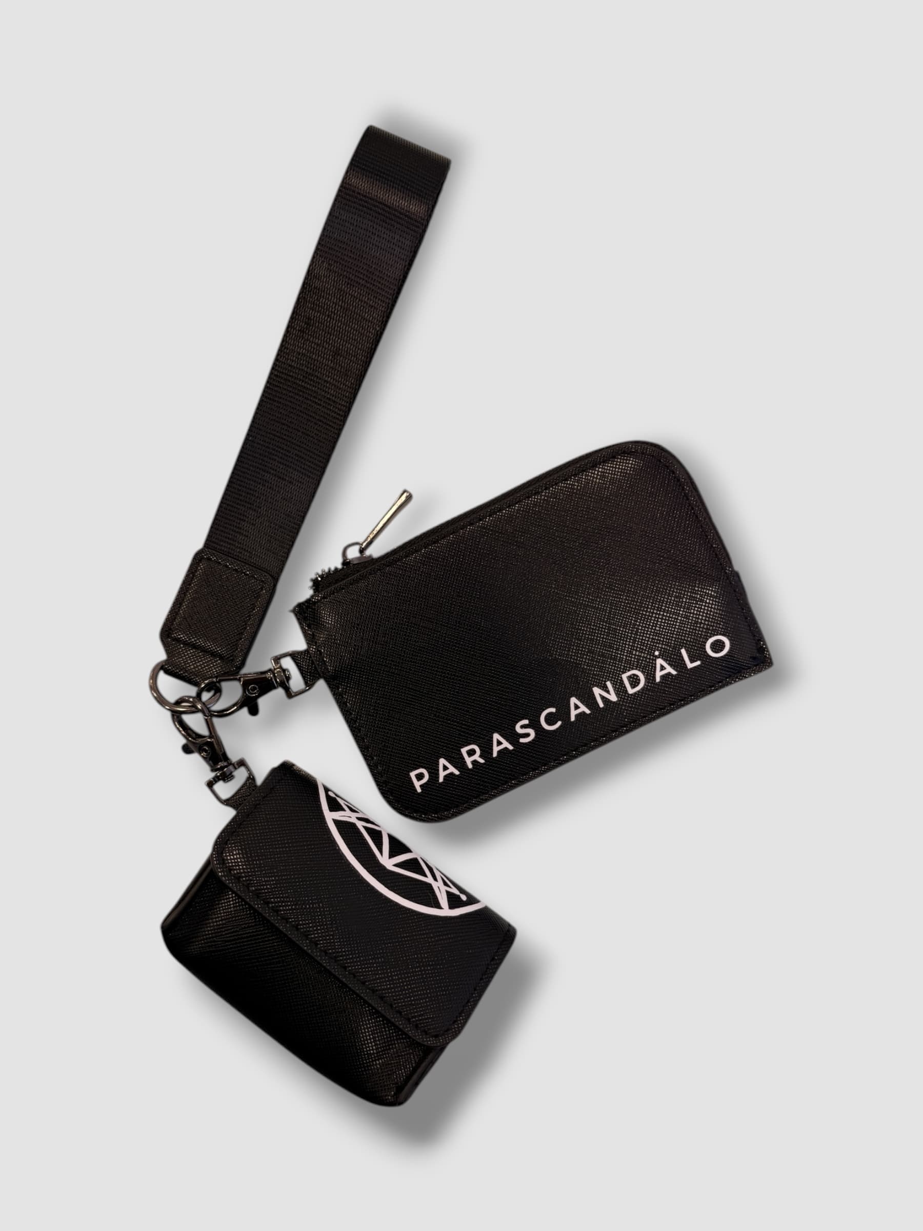 A versatile clip-on set featuring an AirPods pouch and coin pocket with a wristlet, designed for flexible everyday use. Each piece can be worn discreetly on its own or combined for a bold, functional statement. Crafted from 100% Saffiano leather-look material for a sleek, durable finish.